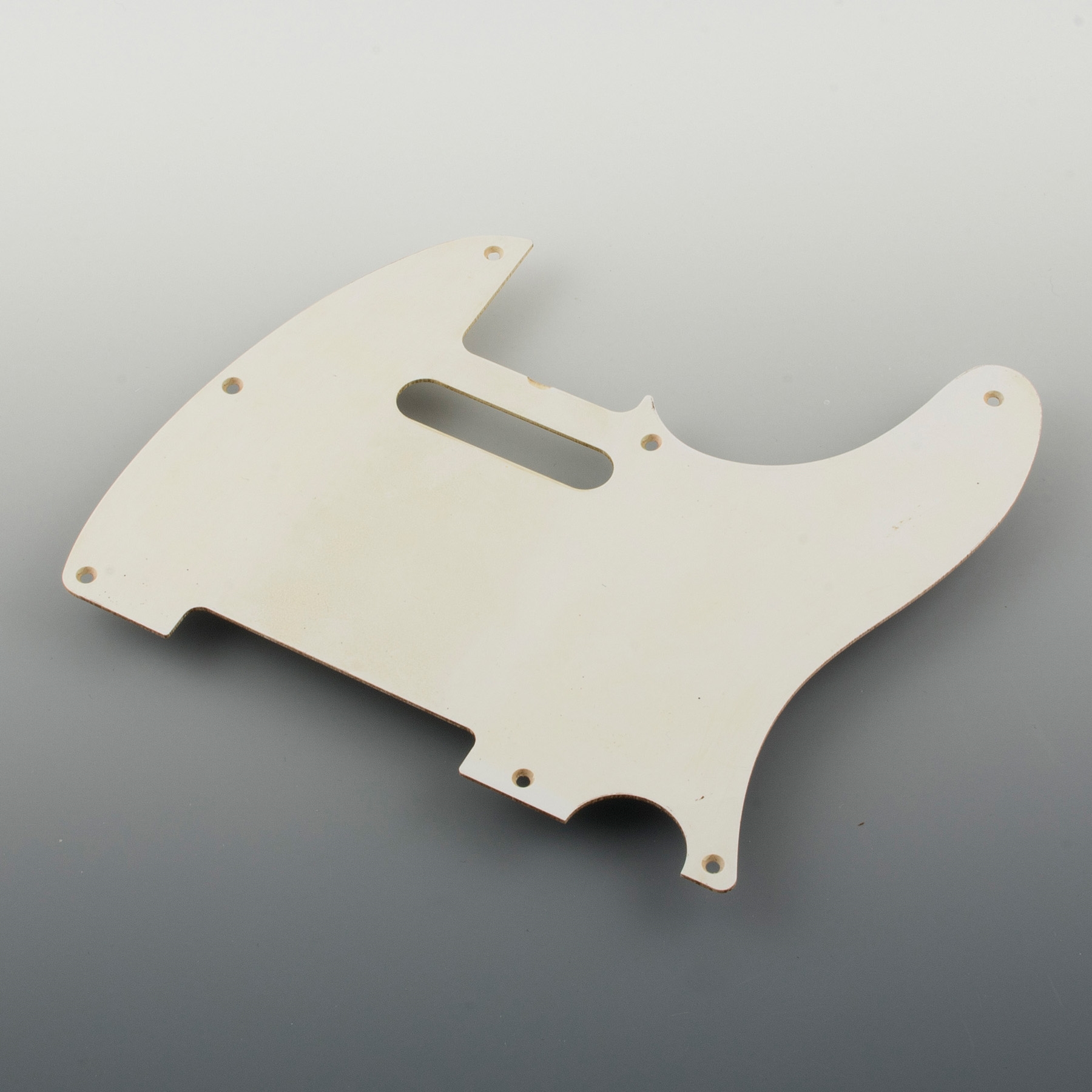A Classic 60's White single ply pickguard 1.5mm thick, vintage correct 0.060", with gentle authentic aging showing darkening across the face, dirt build up in the recesses and with a truss rod scoop.  These are very nice aged pick guards and will look great on your relic Tele.
