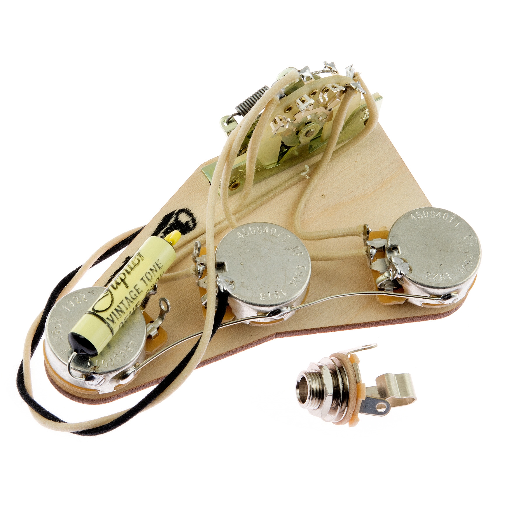 Of course like all our other kits it's wired with 22 AWG vintage push-back wire for that vintage look and sound. If you are installing this on a guitar with metric sized pots you may need to ream your control plate holes to accept the slightly larger US-Spec pots and buy US-Spec knobs.