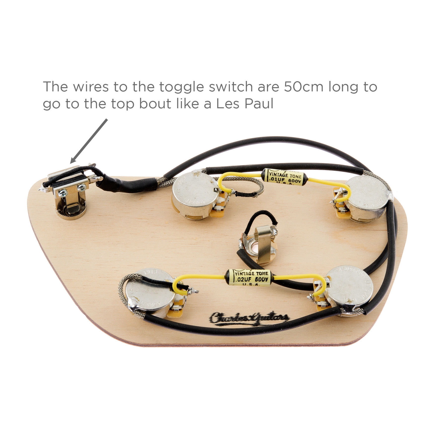 This is a carefully wired “50’s Style” pre-wired harness for Hollow and Semi Hollow guitars where the toggle switch is on the upper bout or further from the controls that a 335 style guitar. For guitars with metric sized pots you may need to enlarge the holes for the higher quality US spec electronics to fit and also you may need US Spec knobs.